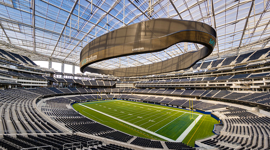 Extreme durability and capacity expectations. Stadium flooring needs to be able to accommodate “way beyond what is just normal foot traffic” as crowds flex for special events, Anderson says. The show floor itself is often expected to hold dirt for motocross at one time, multiple concert stages another, or even a temporary swimming pool when SoFi Stadium will be a host during the Los Angeles Olympics in 2028.