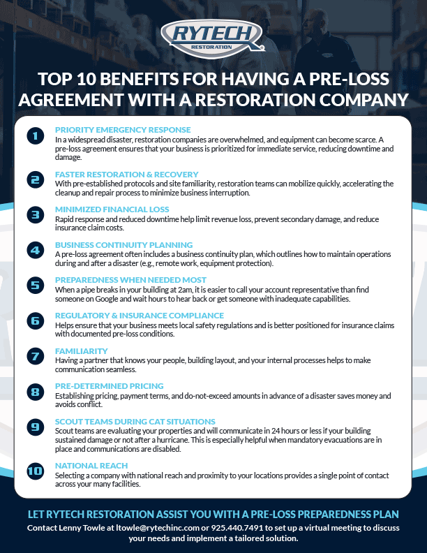 Commercial property damage has greater loss potentials than residential property damage, as critical equipment, material, and products are also subject to damage. Additionally, regular business is interrupted, meaning there is also a loss of revenue. Having a Pre-loss agreement in place, assist you and your facility a fast path back to normal.