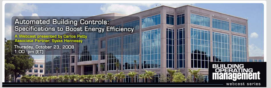 Attend this no-cost, 75-minute Webcast and you will learn the keys to energy cost savings by taking an integrated approach to a building automation systemÃs design. Moderated by Building Operating Management editor Ed Sullivan, the Webcast will give you a roadmap for selecting and specifying automated building controls for optimum energy efficiency.